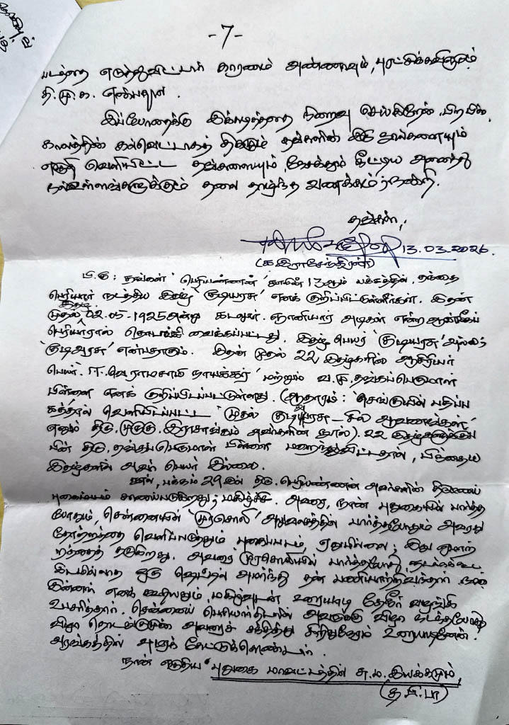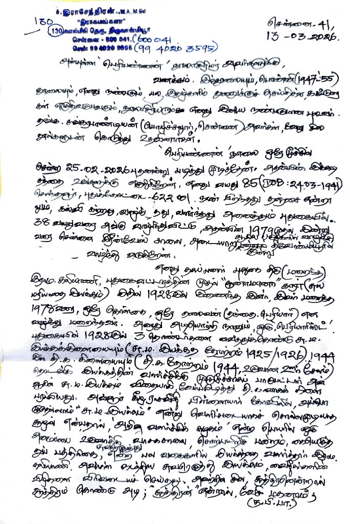 On March 14, 2026, I received a letter from Mr. Rajendran Ayya, who is 85 years old. As some of our readers would know, on September 25, 2025, we celebrated the centenary of my grandfather, AR. Periyannan (who is no more), and I published a book on him. As you can imagine, a lot of hard work went into writing the book, a lot of research, and many conversations with people who knew my grandfather and more.