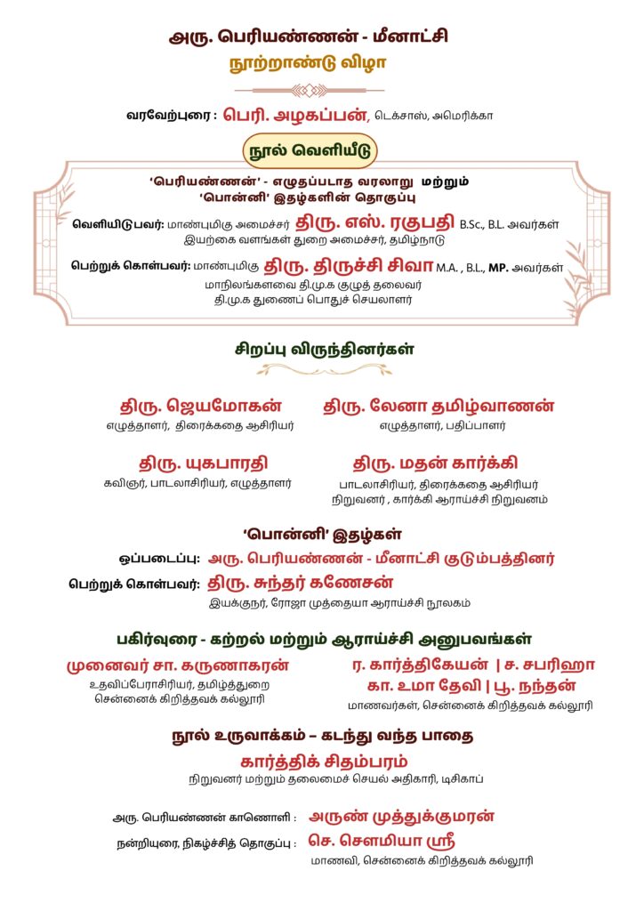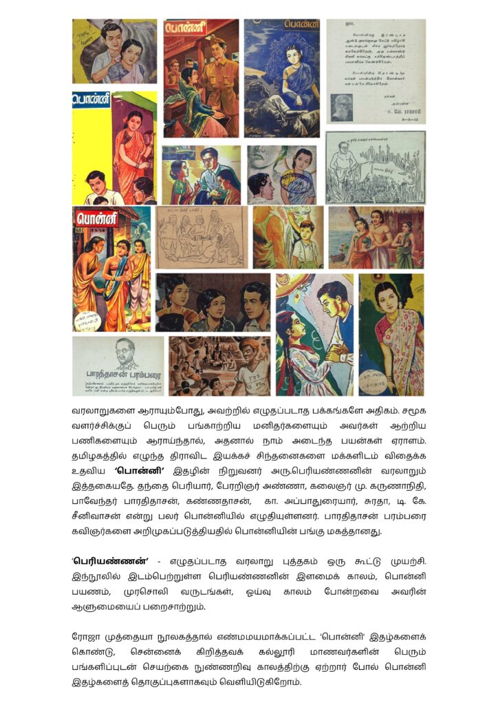 எங்கள் ஐயா அரு. பெரியண்ணன், ஆயா மீனாட்சி நூற்றாண்டினை ஒரு வாய்ப்பாகக் கருதி . 1940களில் அரு. பெரியண்ணன் மற்றும் அவரின் அக்காள் மகன் முருகு சுப்ரமணியம் நிறுவிய, திராவிட இயக்கங்களை வளர்த்தெடுக்க உதவிய “பொன்னி” இதழ்களை எண்ம எண்ம வடிவில், செயற்கை நுண்ணறிவு காலத்திற்கு ஏற்றார் போல் வெளியிடுகிறோம்.