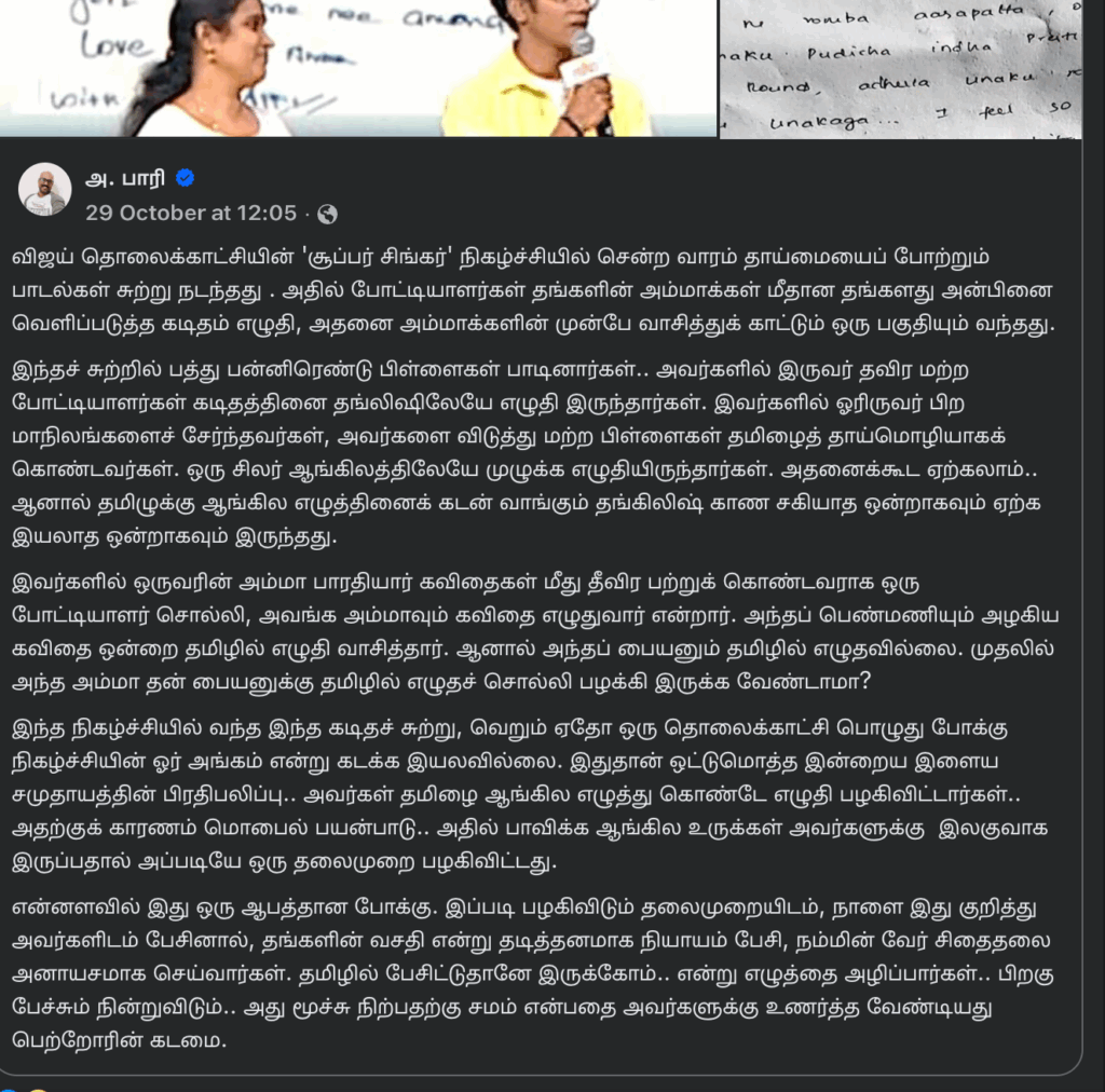 Pari and Neechalkaran Raja referred to a popular Vijay TV show – Super Singer, where the contestants were asked to write a letter in Tamil to their mothers. Out of 10 participants, 8 wrote their letters in English — not the content, but the script. Though the message was in Tamil, the Tamil script itself was not used.